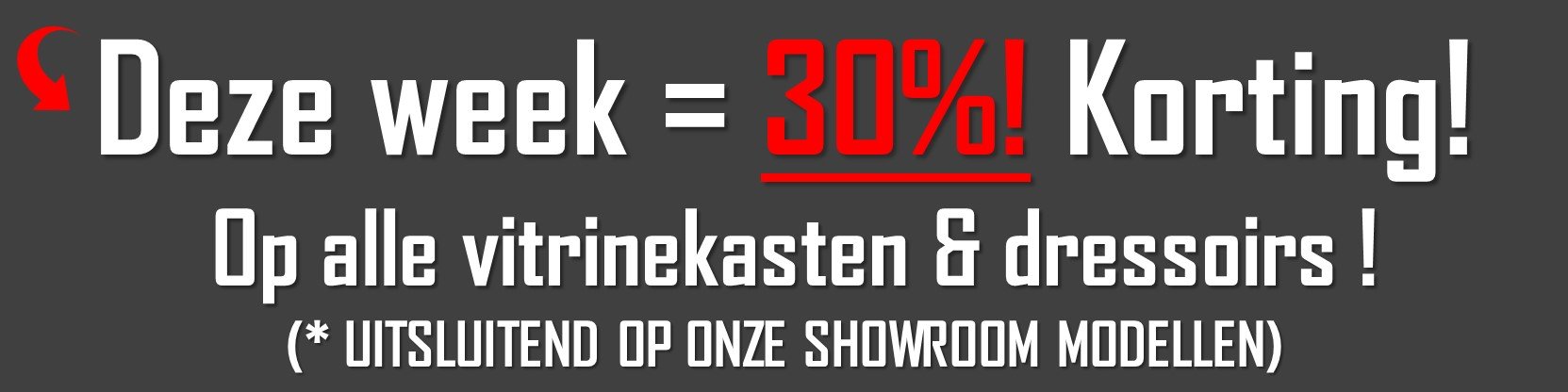 U ontvangt deze week 30% korting op alle vitrinekasten & dressoirs uit de showroom!