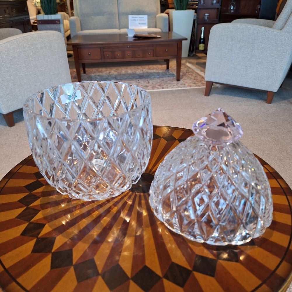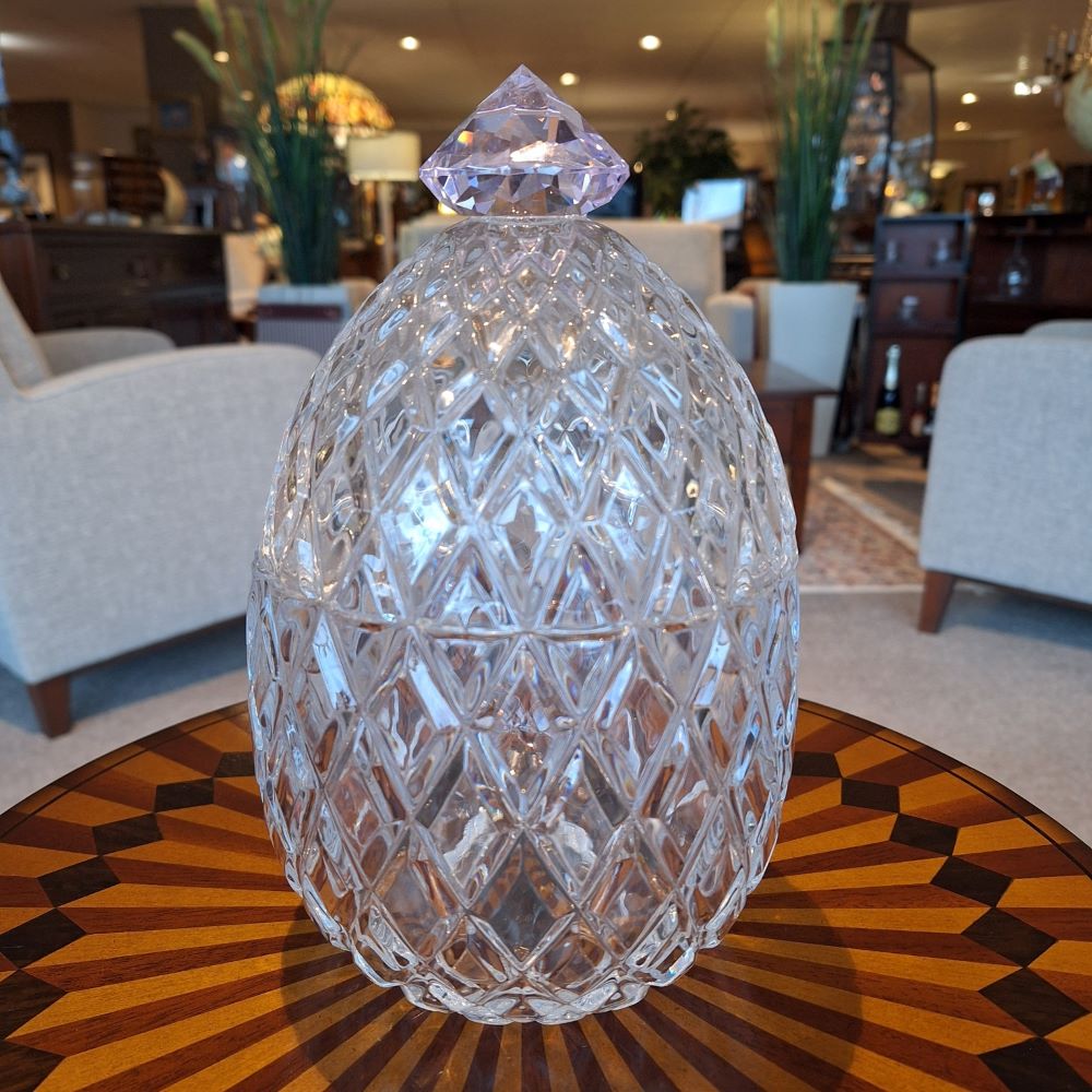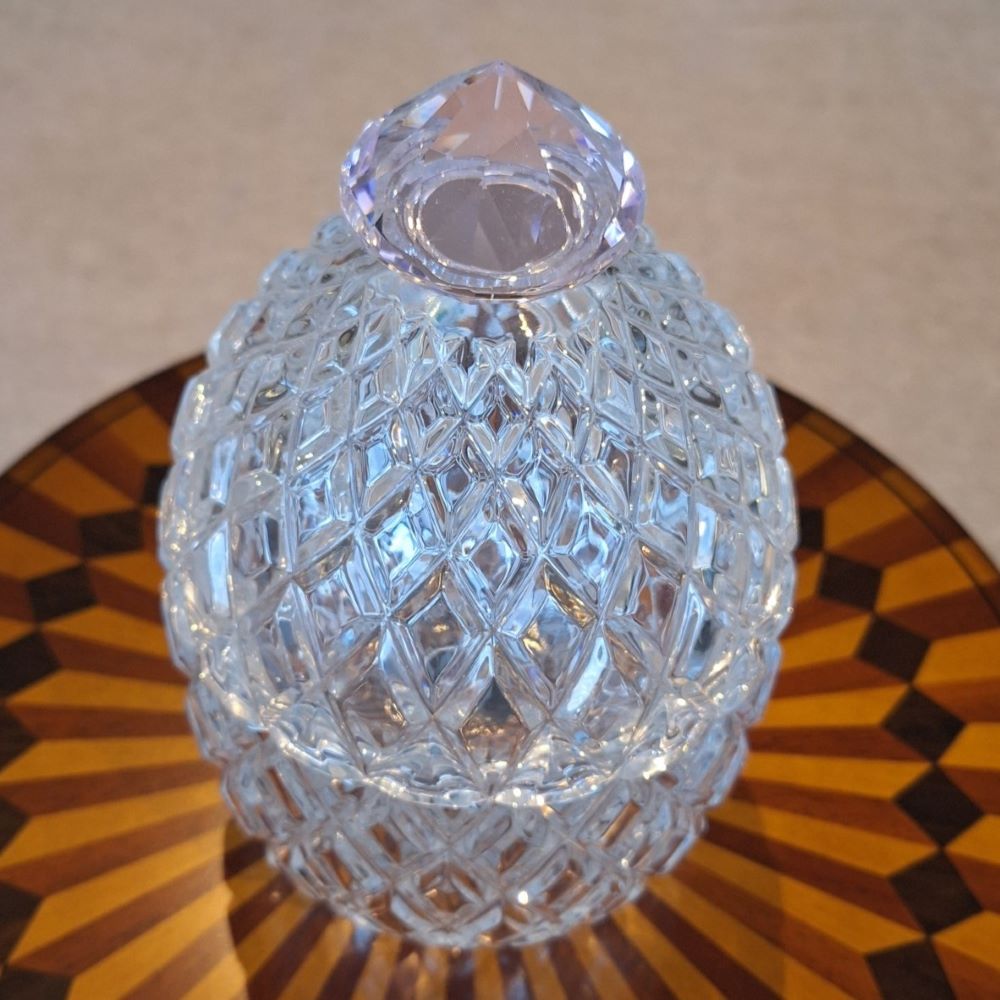 Model: Bonbonniere met diamant vorm op de deksel Kristal Afm: Ø.15 x H.23 cm. Gemaakt in Polen; 24% loodkristal Optie: