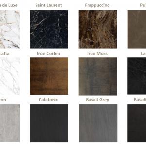 Keramiek 12-kleuren: basalt black, basalt grey, beton, iron corten, iron moss, calacatta, pulpis, frappuccino en saint laurent.