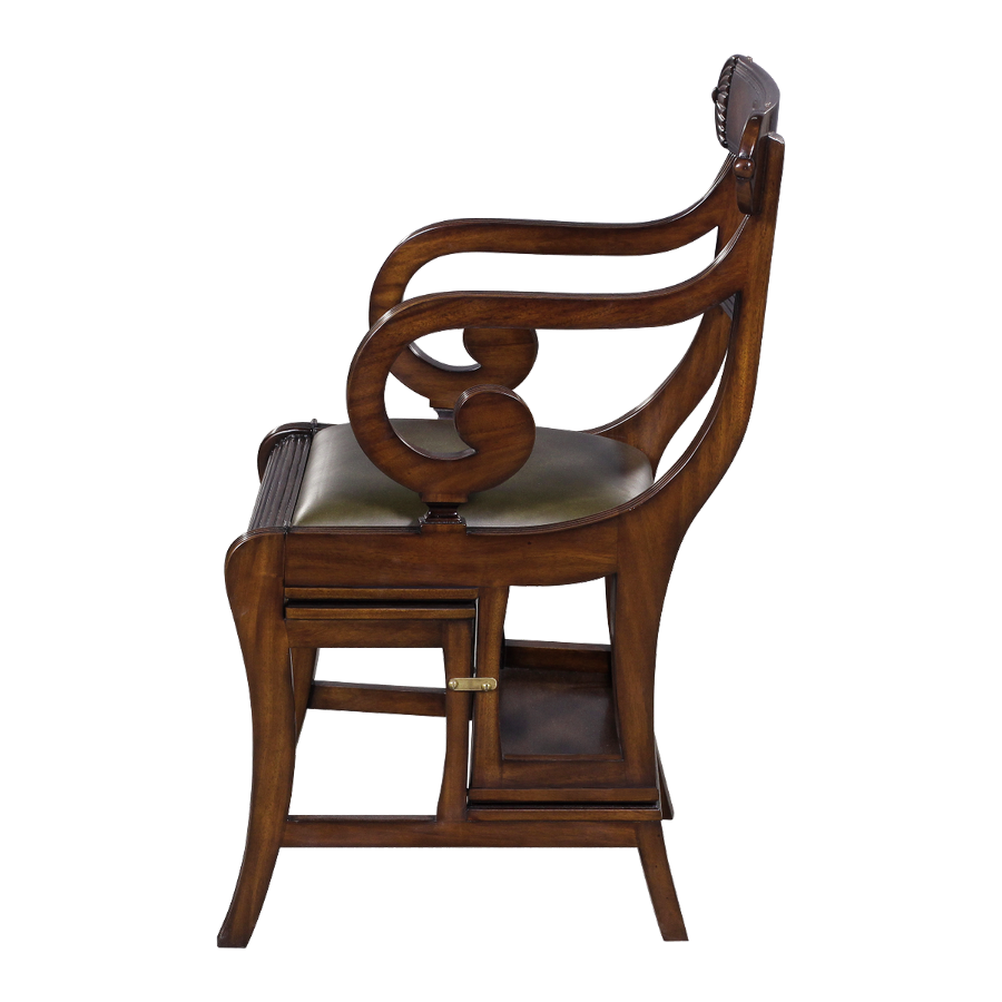 Klassieke fauteuil model: English Library Chair (trapstoel) Afm: H.89 x B.57 x D.53 cm Mahonie + wortelnoten Leer: Antiek groen High-end Luxury Furniture