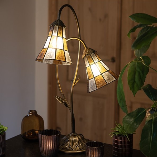 Stijlvol voor op het dressoir of op een bijzettafeltje, beige Tiffany tafellamp met twee lampenkappen, in een klassieke stijl met een landelijke uitstraling, gemaakt van polyresin en glas.