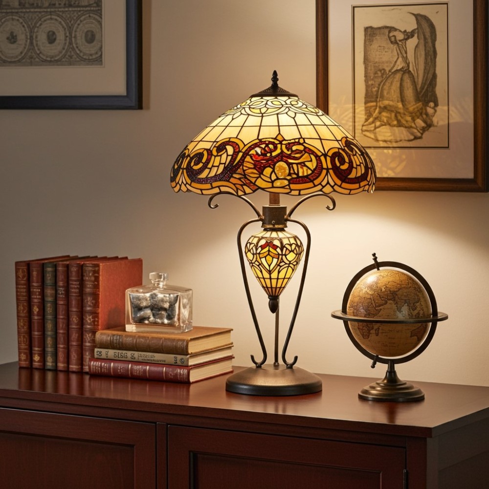 Een bijzonder mooie tafellamp. Helemaal met de hand gemaakt van echt Tiffanyglas.